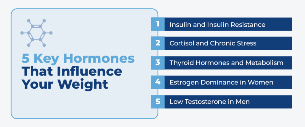 Hormone dysregulation can influence weight management in many ways, from a drop in estrogen due to menopause or elevated cortisol from chronic stress. The five main hormones that can influence your weight are: